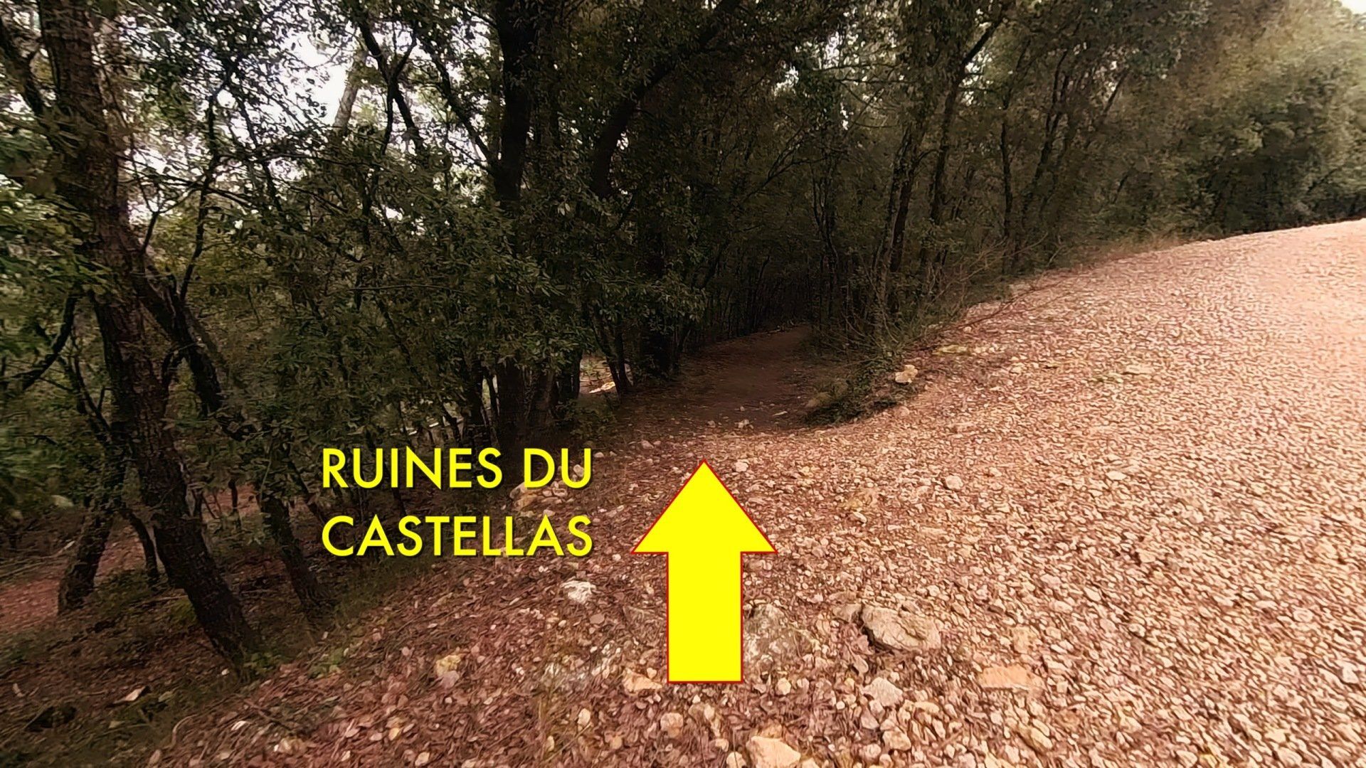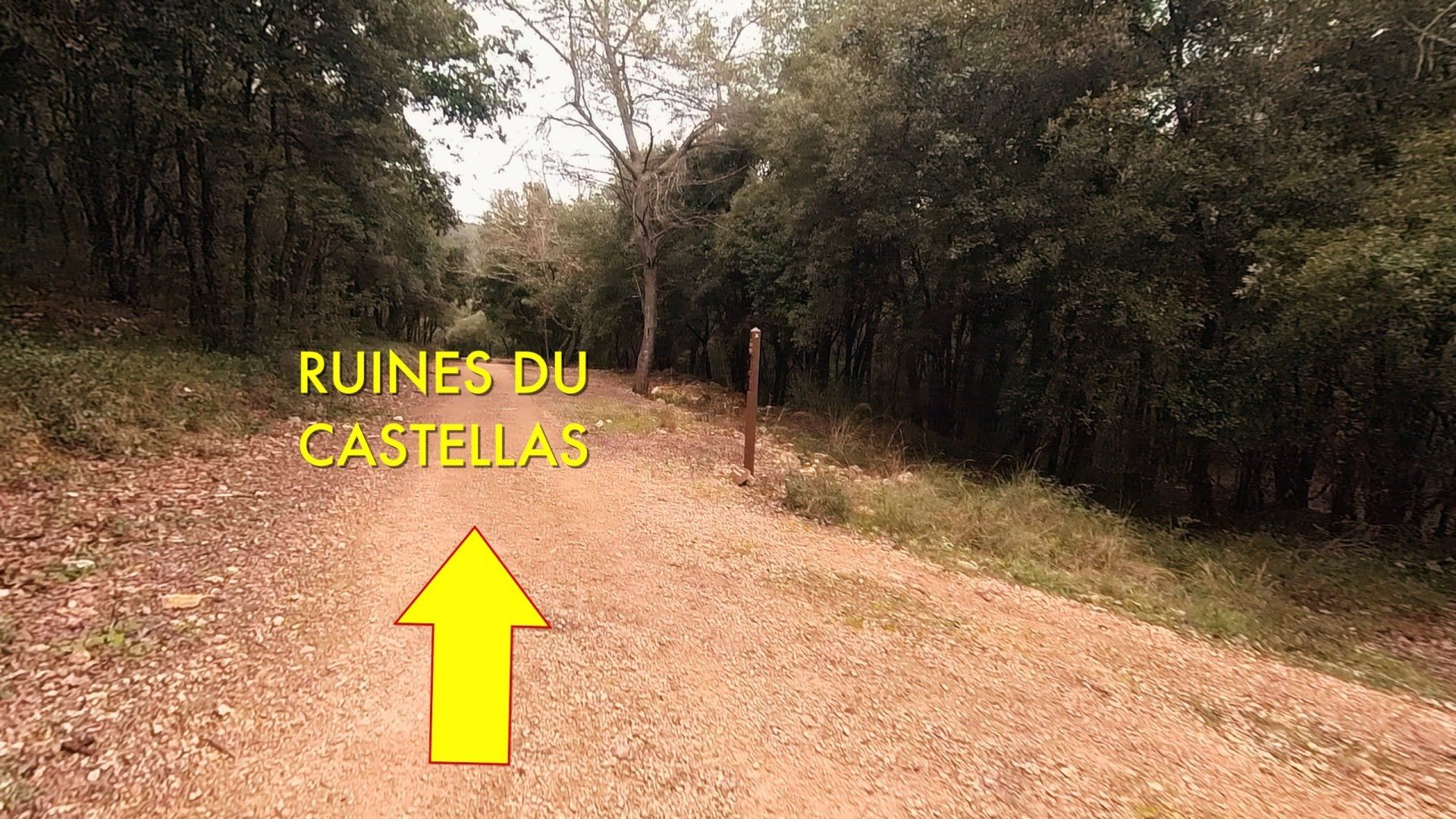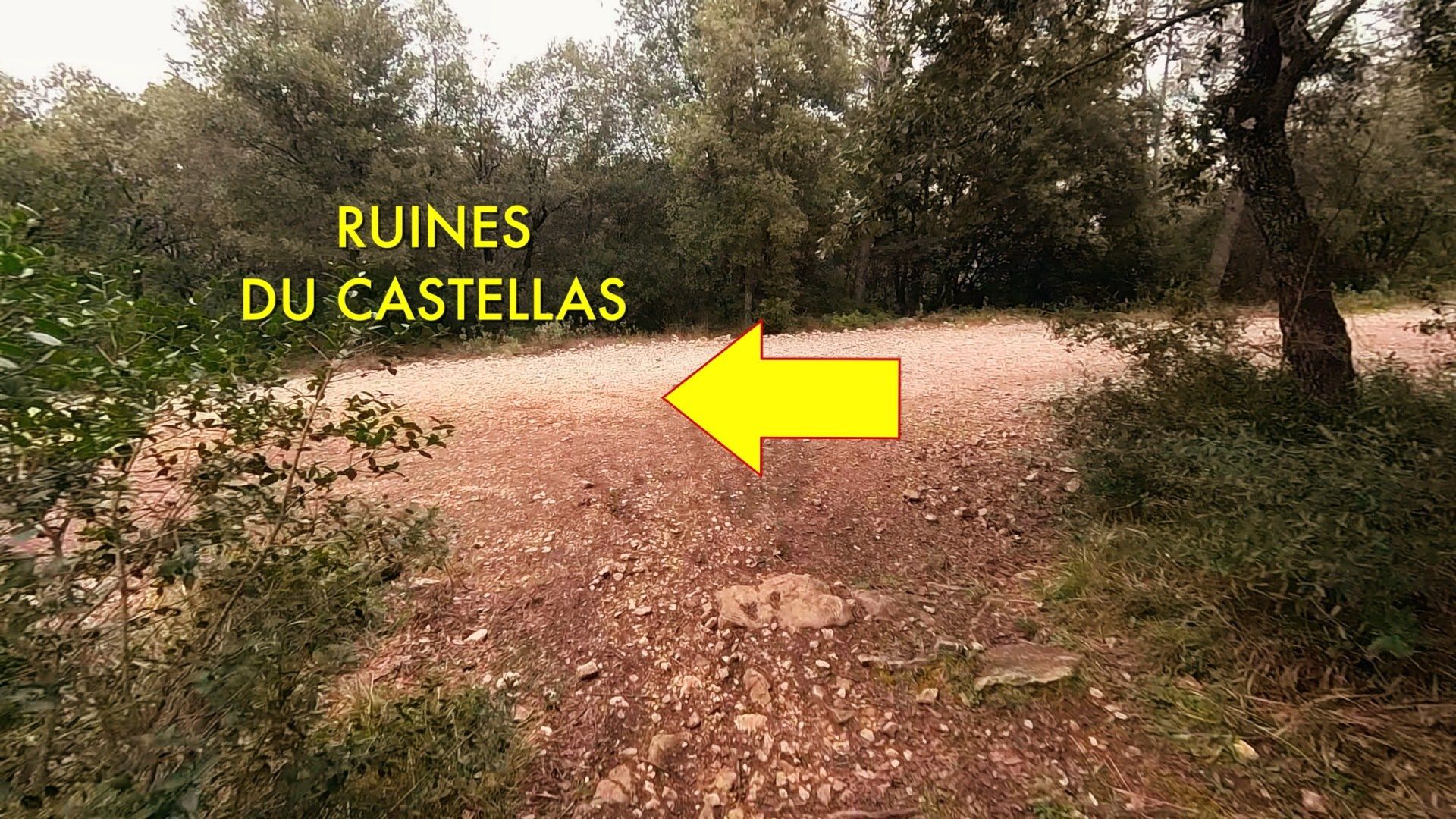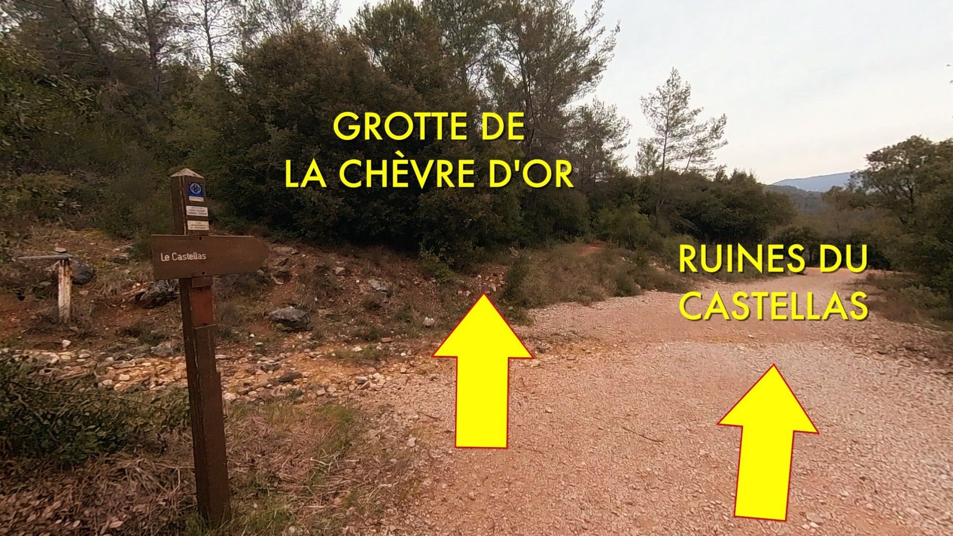 À la sortie du sentier, on arrive à la piste du Castellas qu'il faut continuer à descendre si on souhaite aller découvrir la Grotte ou les ruines.
